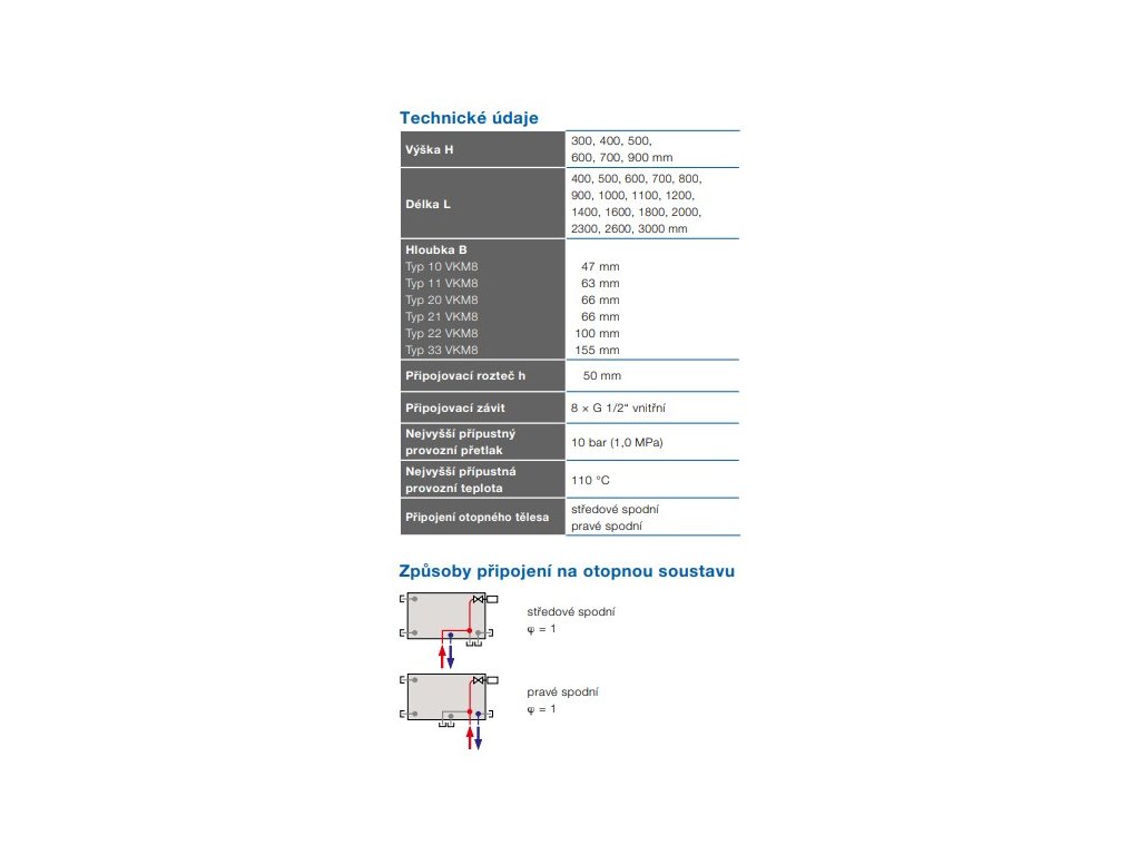 Model RADIK VKM8 je deskové otopné těleso v provedení VENTIL KOMPAKT, které umožňuje spodní středové nebo pravé spodní připojení na otopnou soustavu. Typy 20, 21, 22 a 33 mají jednotnou vzdálenost spodního středového připojení od stěny. Ze zadní strany jsou přivařeny dvě horní a dolní příchytky, otopná tělesa o délce 1800 mm a delší mají navařených šest příchytek. Desková otopná tělesa RADIK VKM8 jsou svou konstrukcí určena pro moderně řešené otopné soustavy s nuceným oběhem teplonosné látky a horizontálně vedeným rozvodným potrubím pod otopným tělesem v podlaze, ve stěně nebo po stěně zakryté lištou.Záruka: 10 let na těsnost radiátoru a 2 roky na povrchovou úpravu.